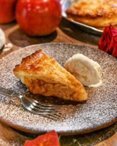 立科産紅玉りんごを100%使用した甘酸っぱくて後味の良いアップルパイに仕上げております。思わず笑みがこぼれる秋の定番のデザートとしてご提供しております。